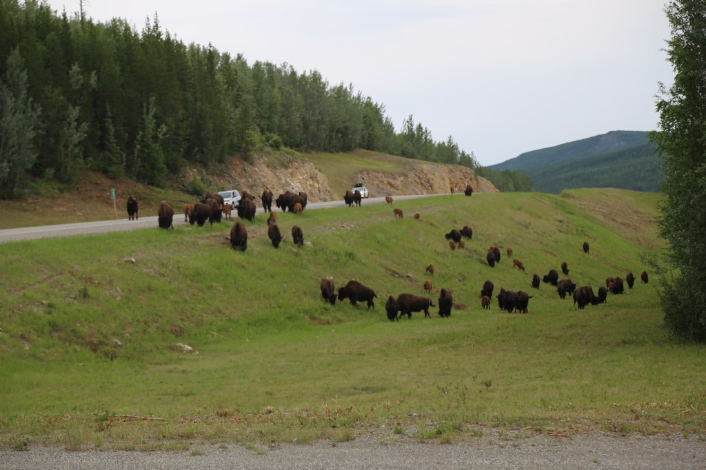 Buffalo! Blocking the road on the stretch between Rocky Mountain Lodge and Watson Lake, right at the northern British Columbia border. It took about 5 minutes for the herd to clear the road so cars could pass.
