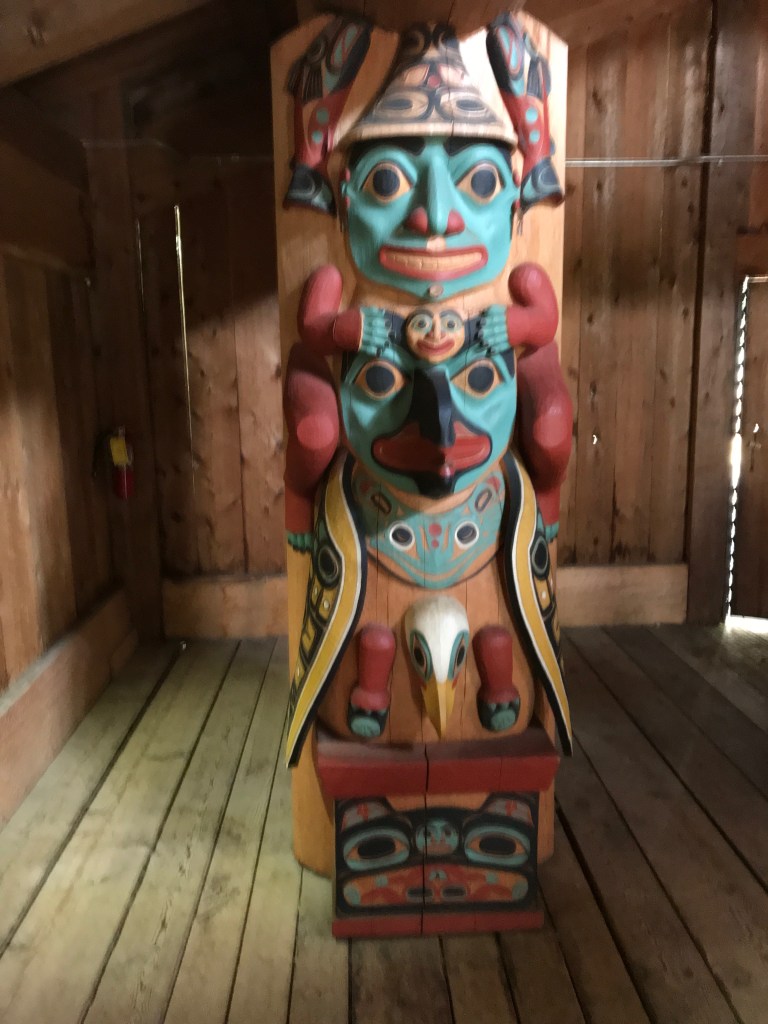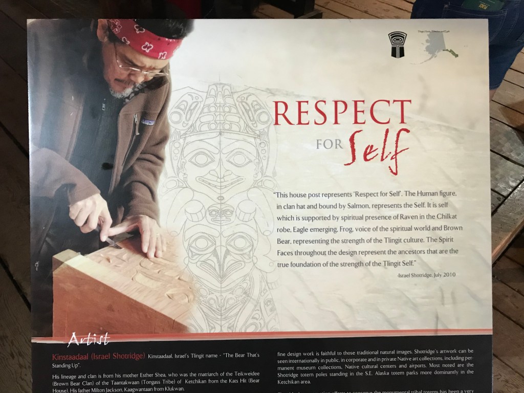 This house for the Tlingit culture has four carved posts. This one represents Respect for Self.