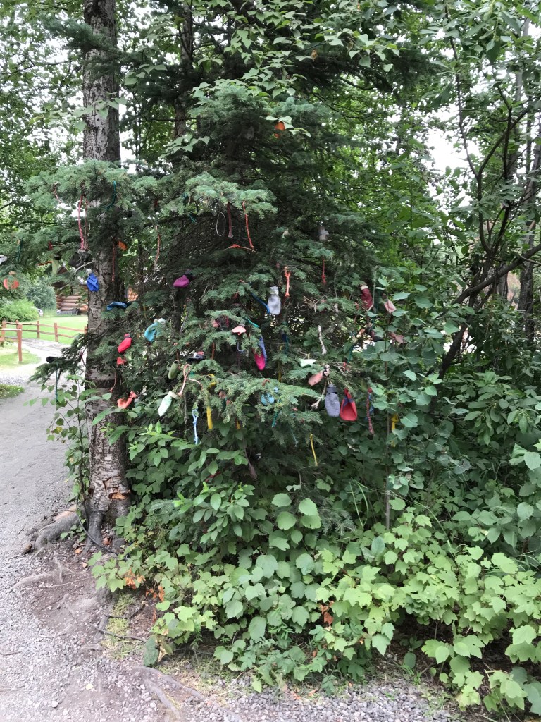 A tree decorated with discarded dog booties.