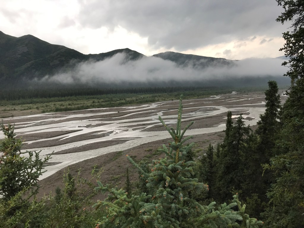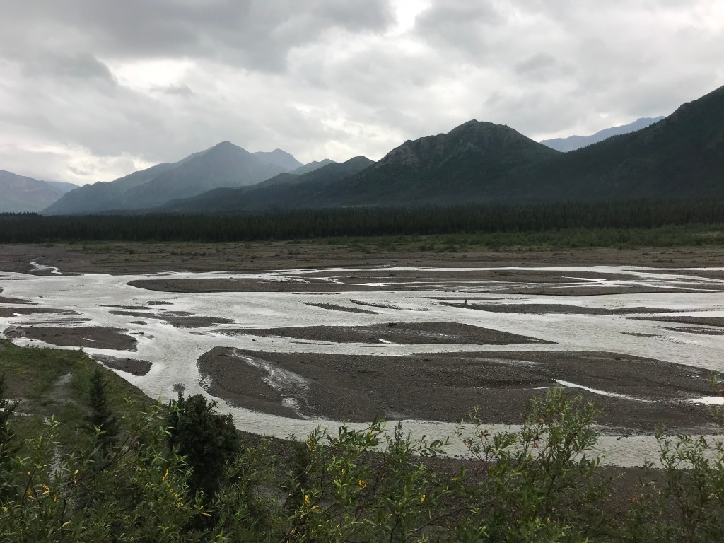 A valley glacier! Driving south from Tok, AK, to Anchorage on day 8 – after seeing snow-capped peaks in the distance, it was a shock to suddenly see the snow and ice below us on a valley floor with the normally forested hillsides around it.