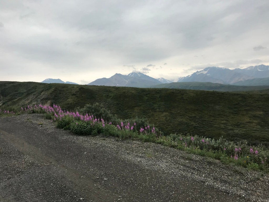 The colorful flora is fireweed, which was ubiquitous along the roadsides in Alaska, the Yukon and northern British Columbia.