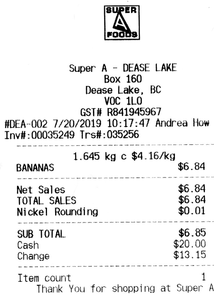 Dease Lake has only one (very!) general store, the Super A. Note on this receipt that the Canadians are doing “nickel rounding” – we never received pennies in change.
